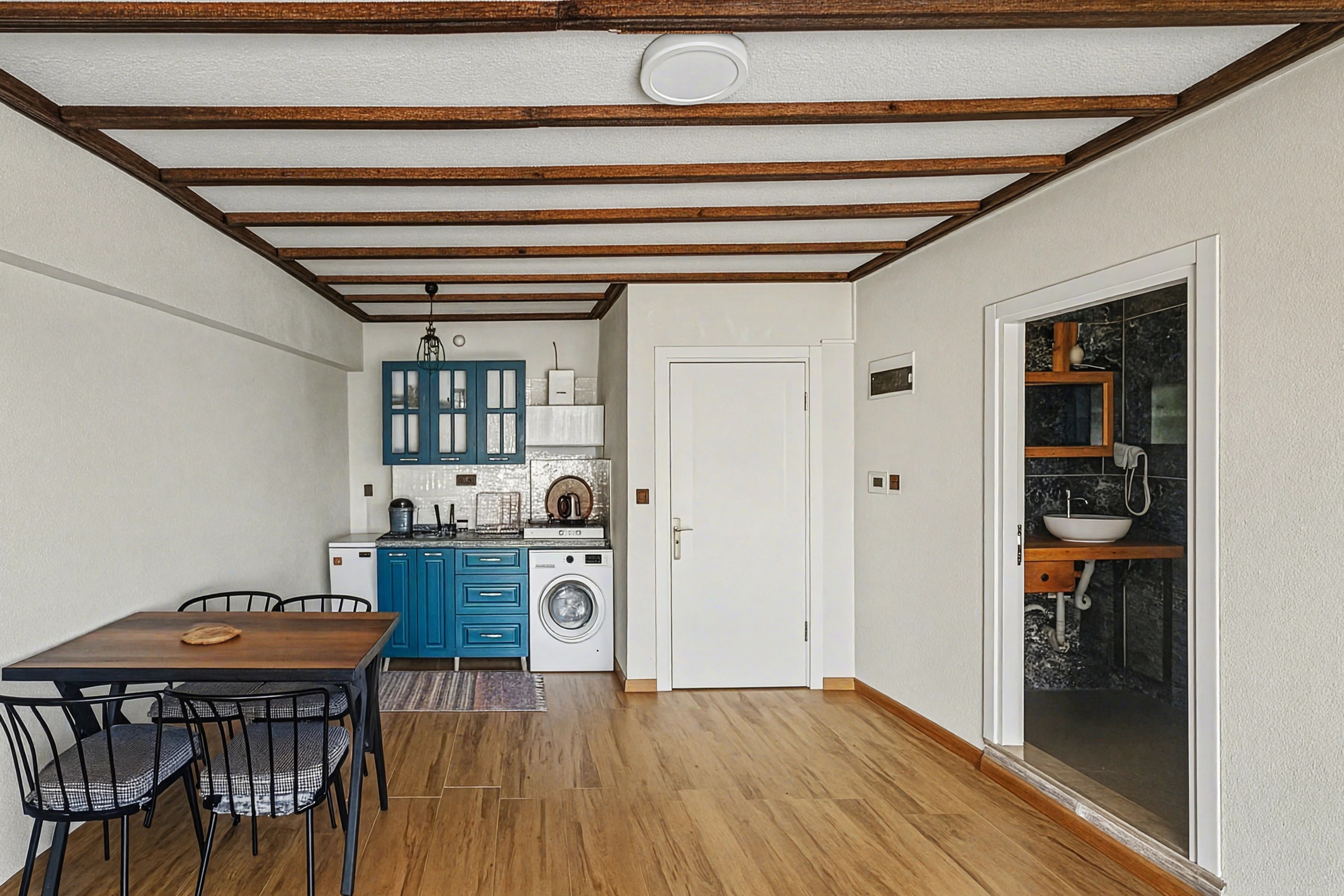 Oda içerisinde ayrı yatak odası, oturma alanı, yemek masası ve mutfak bulunmaktadır. Ev konforu sunan yerleşimi sayesinde hem kısa süreli tatiller hem de uzun süreli konaklamalar için uygundur. Erdek’te sade, rahat ve pratik bir konaklama arayan misafirler tarafından tercih edilmektedir.